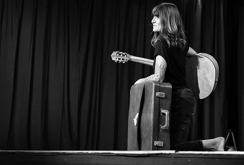 Laureen chante, gratte, tournoie. Elle est votre guide, mais aussi la mère de Brassens, De Gaule, la commère...une énergie scénique qui casse les codes de l’hommage traditionnel.